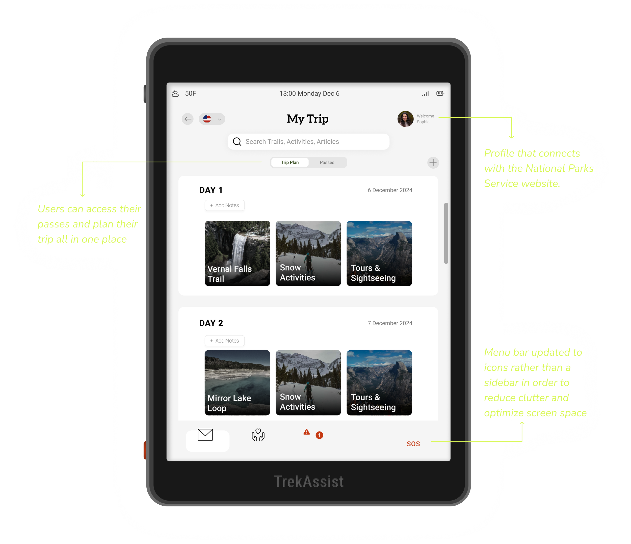 Design a user-friendly and accessible interface for a solar-powered e-ink device that seamlessly integrates navigation, safety alerts, and trip planning while offering features to encourage donations and accommodate diverse user needs, enhancing the overall park experience.