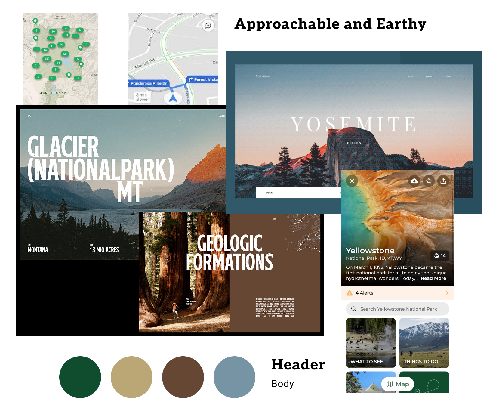 For typography, we chose a pair of sans serif and serif fonts. We opted to incorporate serif styles into specific aspects of the app, capitalizing on their ability to evoke a sense of history. Given Yellowstone's rich heritage which is prominently detailed in our app, it was essential our visual design reflect the same.
