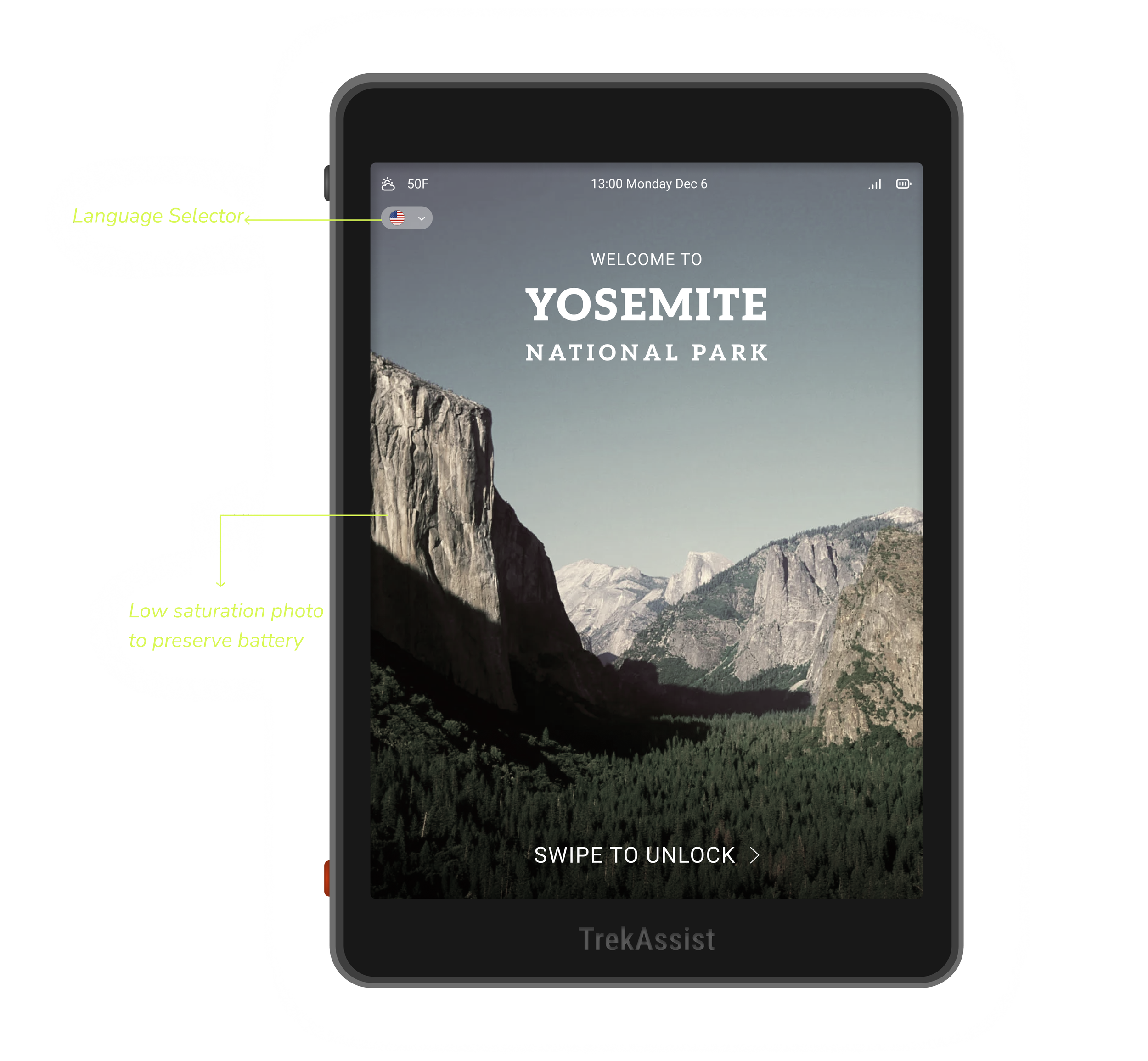 TrekAssist is a solar-powered color e-ink device designed to enhance eco-tourism and visitor safety in U.S. national parks, starting with a pilot project in Yellowstone. It integrates real-time GPS, emergency services, multilingual guides, and eco-friendly tips, with an accessible and intuitive user interface tailored for diverse park visitors.